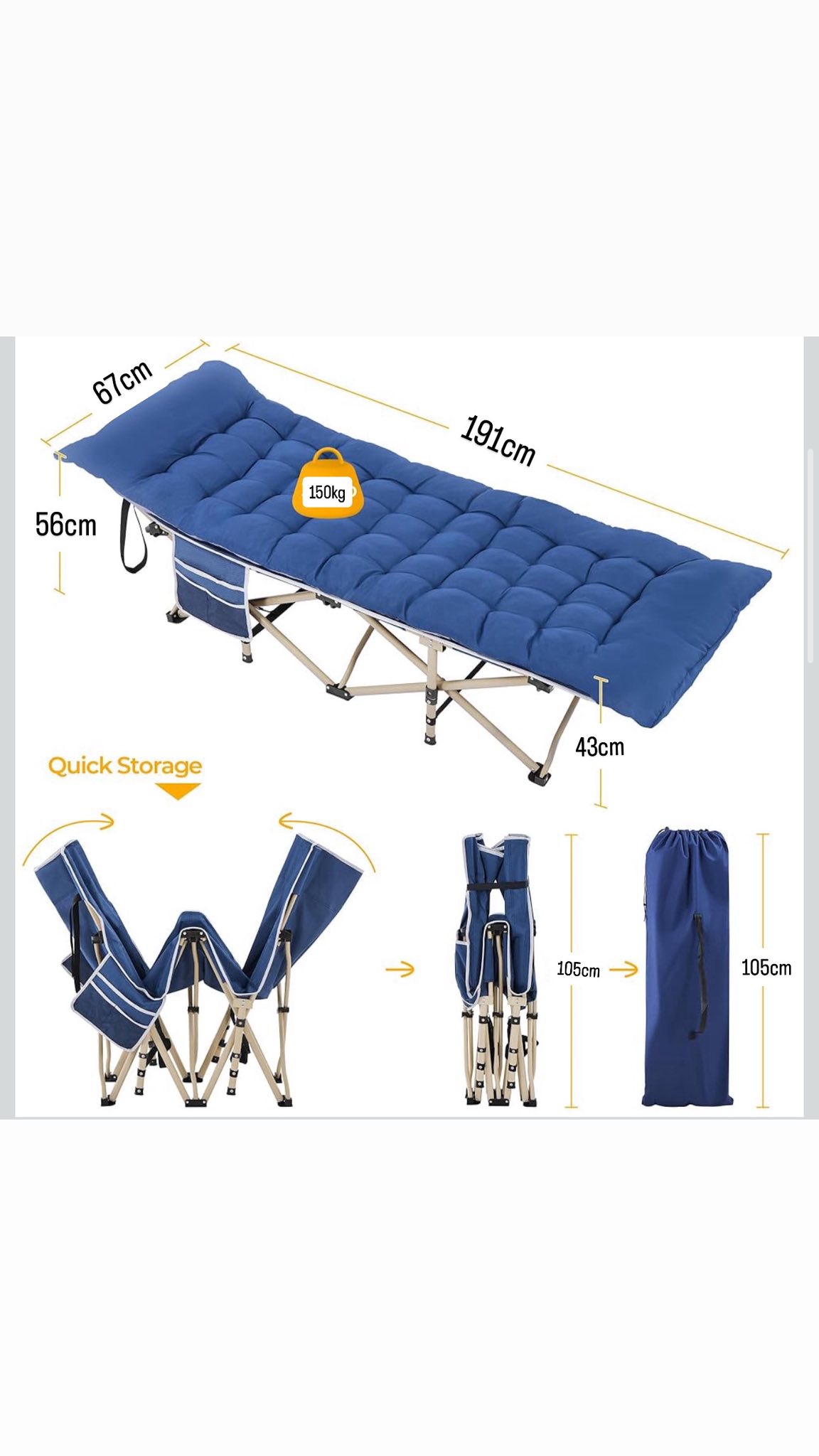 Patogesnė stovyklavimo lova: ši atnaujinta sulankstoma lauko lova turi 7,9 cm storio minkštą čiužinuką su 90 g poliesterio užvalkalu ir aukštos kokybės medvilniniu užpildu. Kad medvilnė nesusigumtų ar neslinktų, čiužinukas yra siūtas vertikaliai ir horizontaliai, todėl užpildas lieka tolygiai paskirstytas.