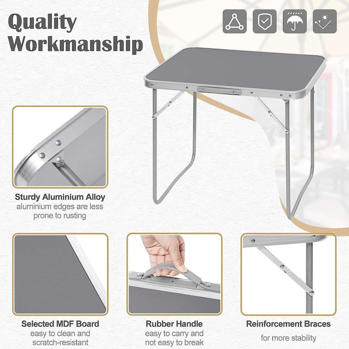 Kokybiškas apdirbimas: stalviršis padengtas apsaugine danga, todėl paviršius atsparus vandeniui. Nepalikite ant paviršiaus vandens balų ir nelaikykite stalo lauke lietaus metu. Kraštai yra užapvalinti, kad būtų išvengta sužeidimų. Apsauginiai kraštai suprojektuoti taip, kad sulankstytos kojos būtų paslėptos.