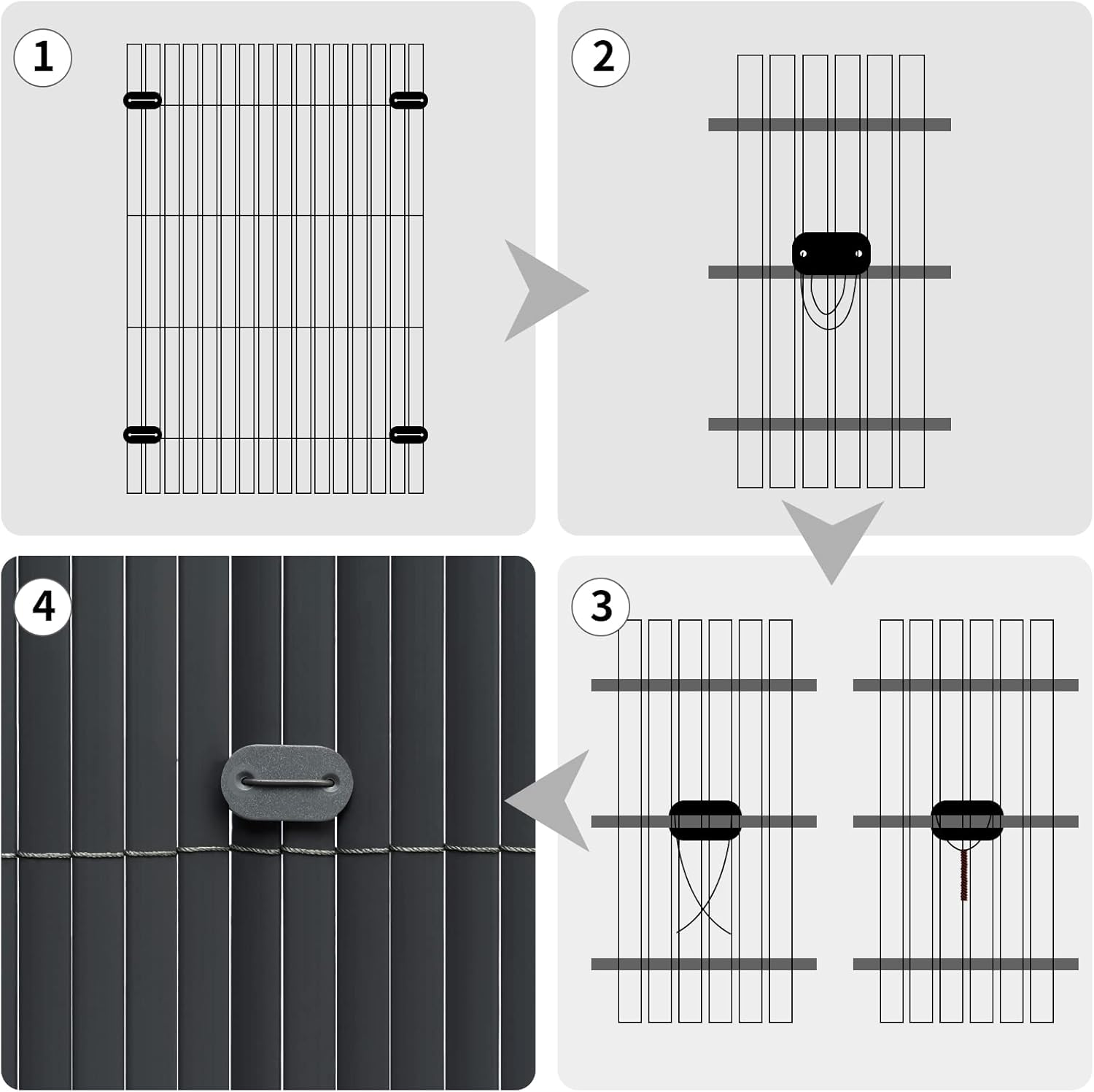 Lengvas montavimas: privatumo užtvarą galima lengvai pritvirtinti arba nuimti naudojant komplekte esančius tvirtinimo elementus. Montuojant tvorelė neturėtų būti pakabinta ore, nes dėl svorio kai kurios juostos gali nuslysti.