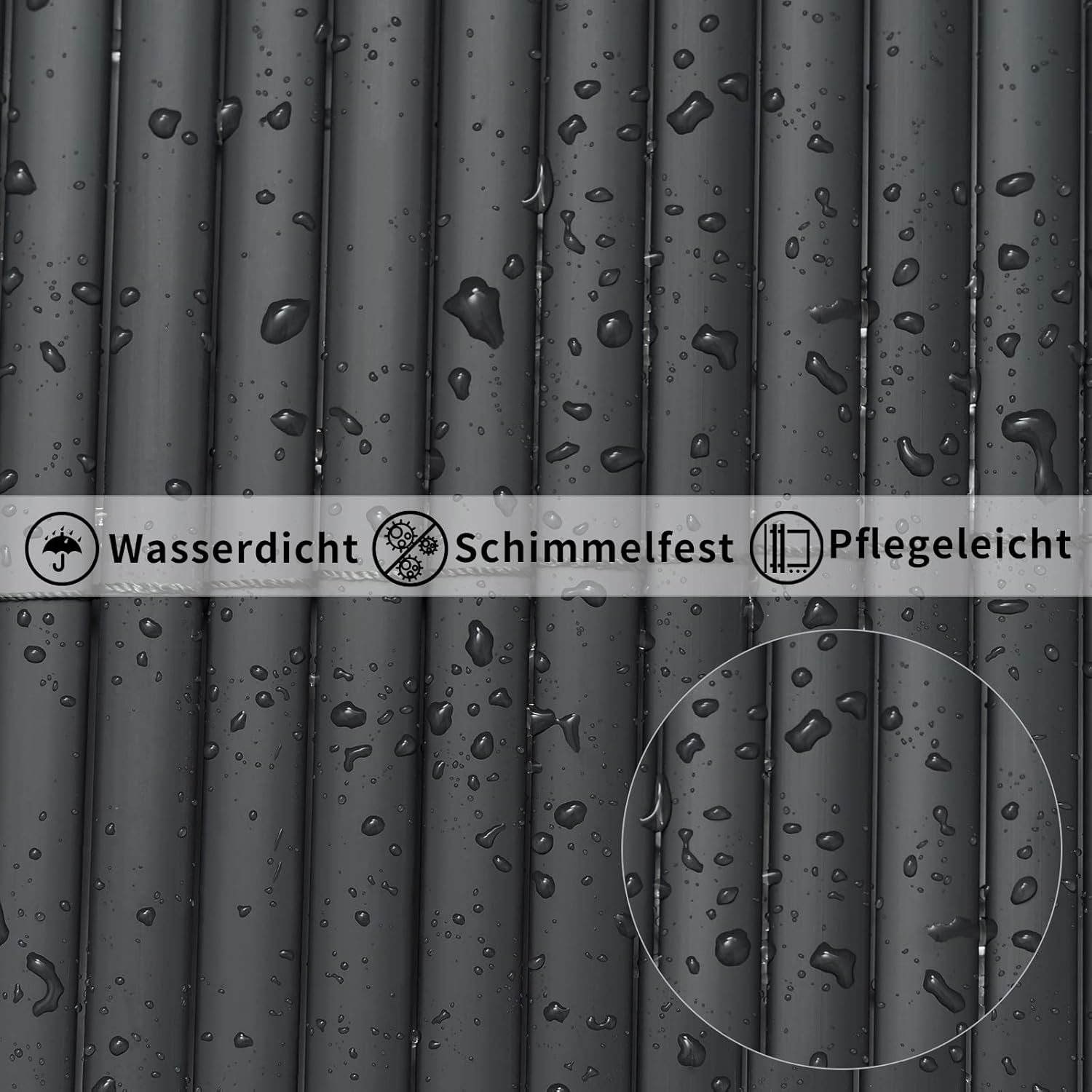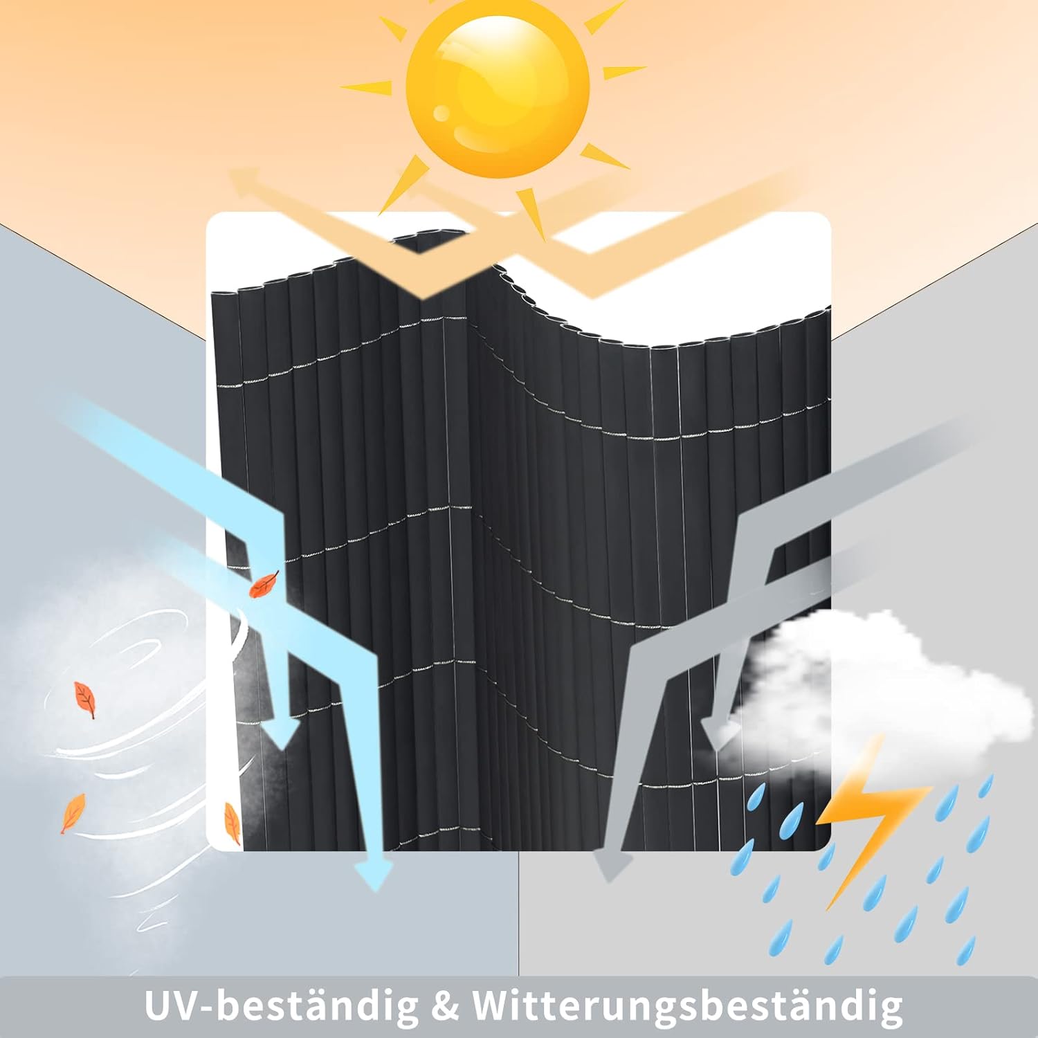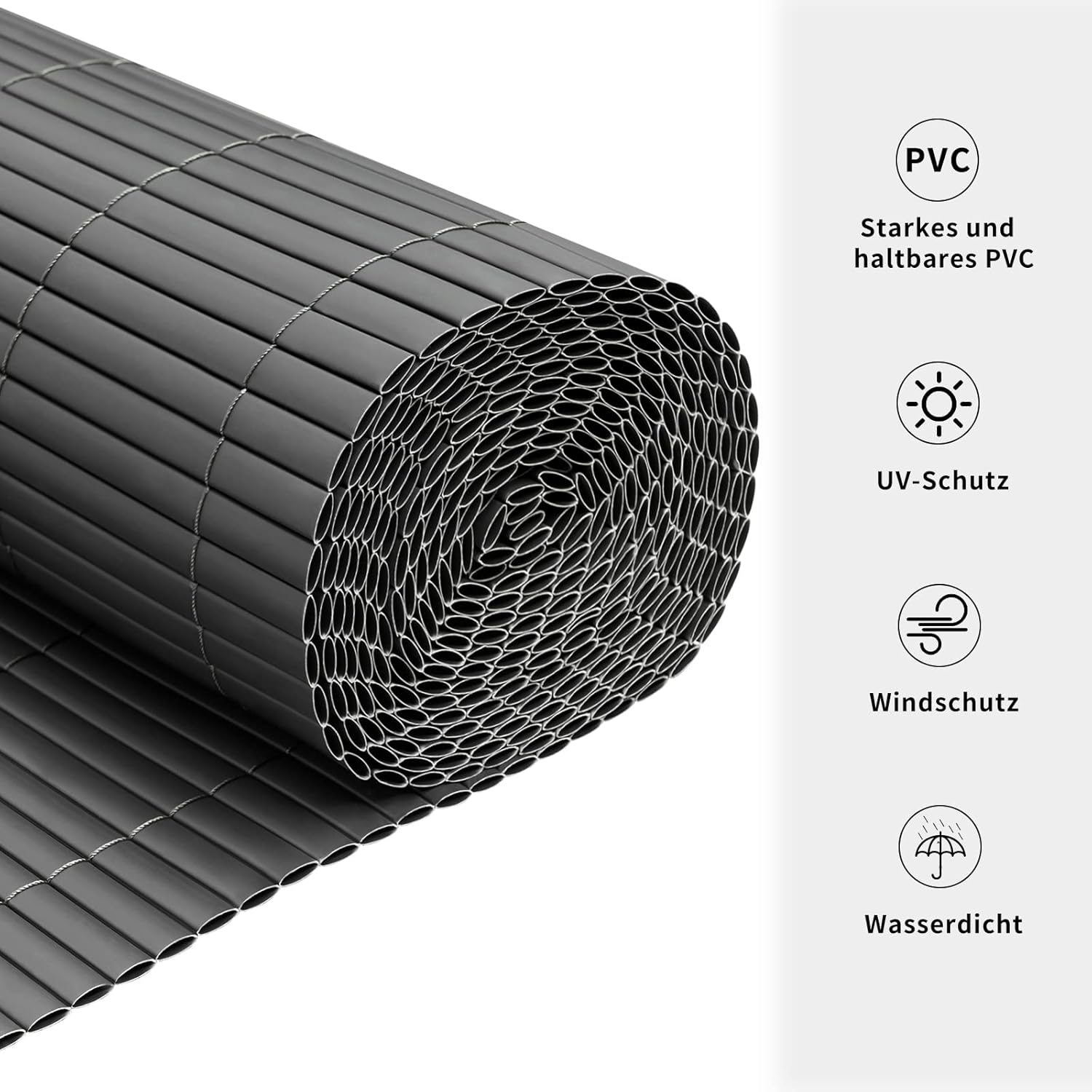 Privatumo apsauga: nepermatomas PVC privatumo kilimėlis turi mažus 1–2 mm tarpus, kurie reikalingi montavimui ir užtikrina oro cirkuliaciją. Tuo pačiu jis apsaugo nuo pašalinių žvilgsnių, suteikia daugiau privatumo ir padeda papuošti sodą, terasą ar balkoną.