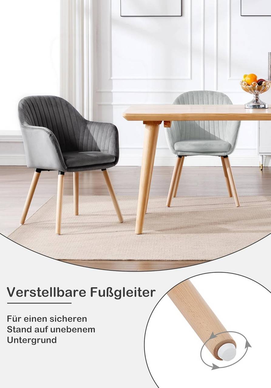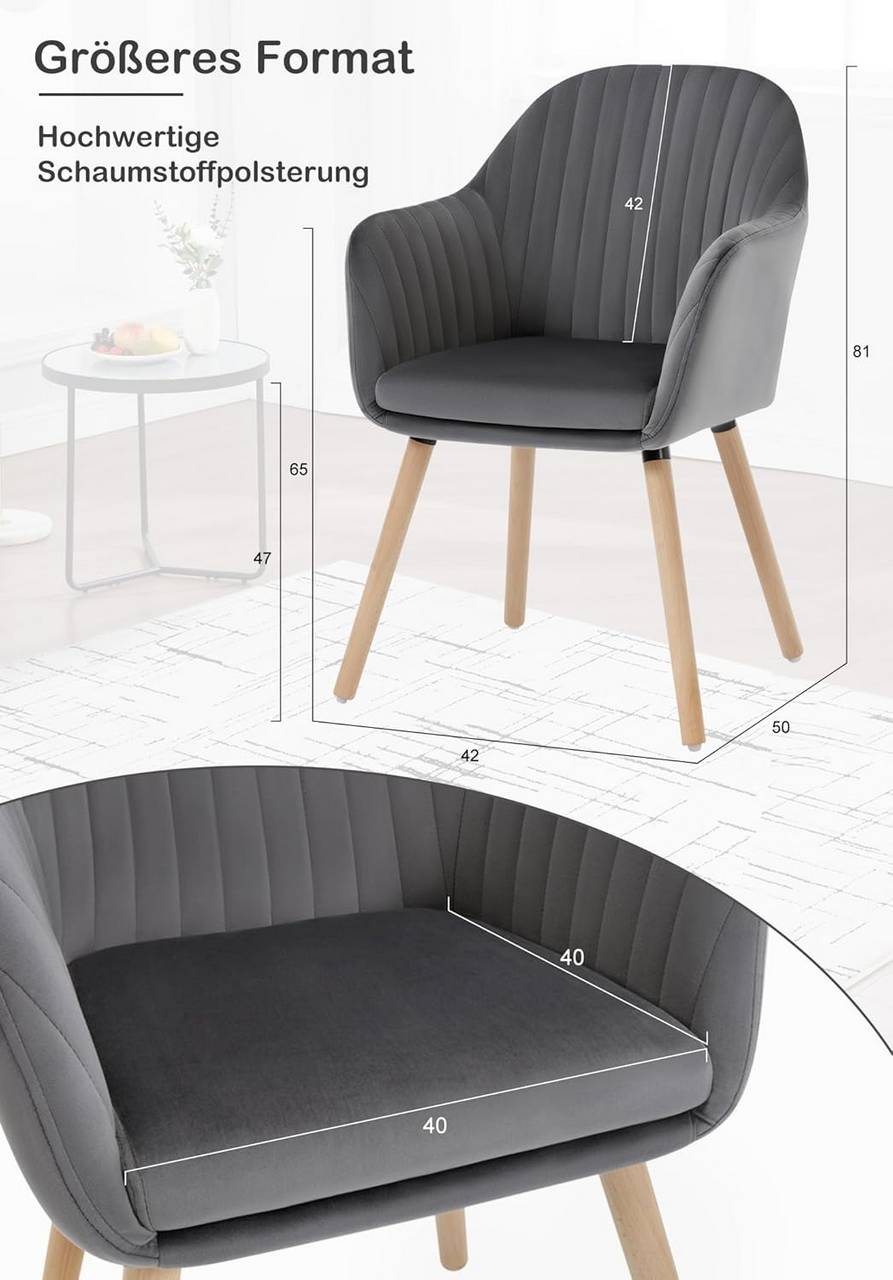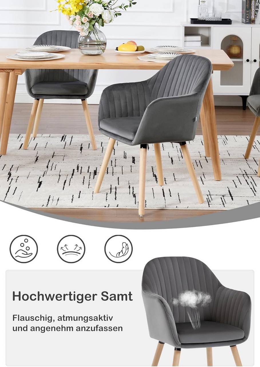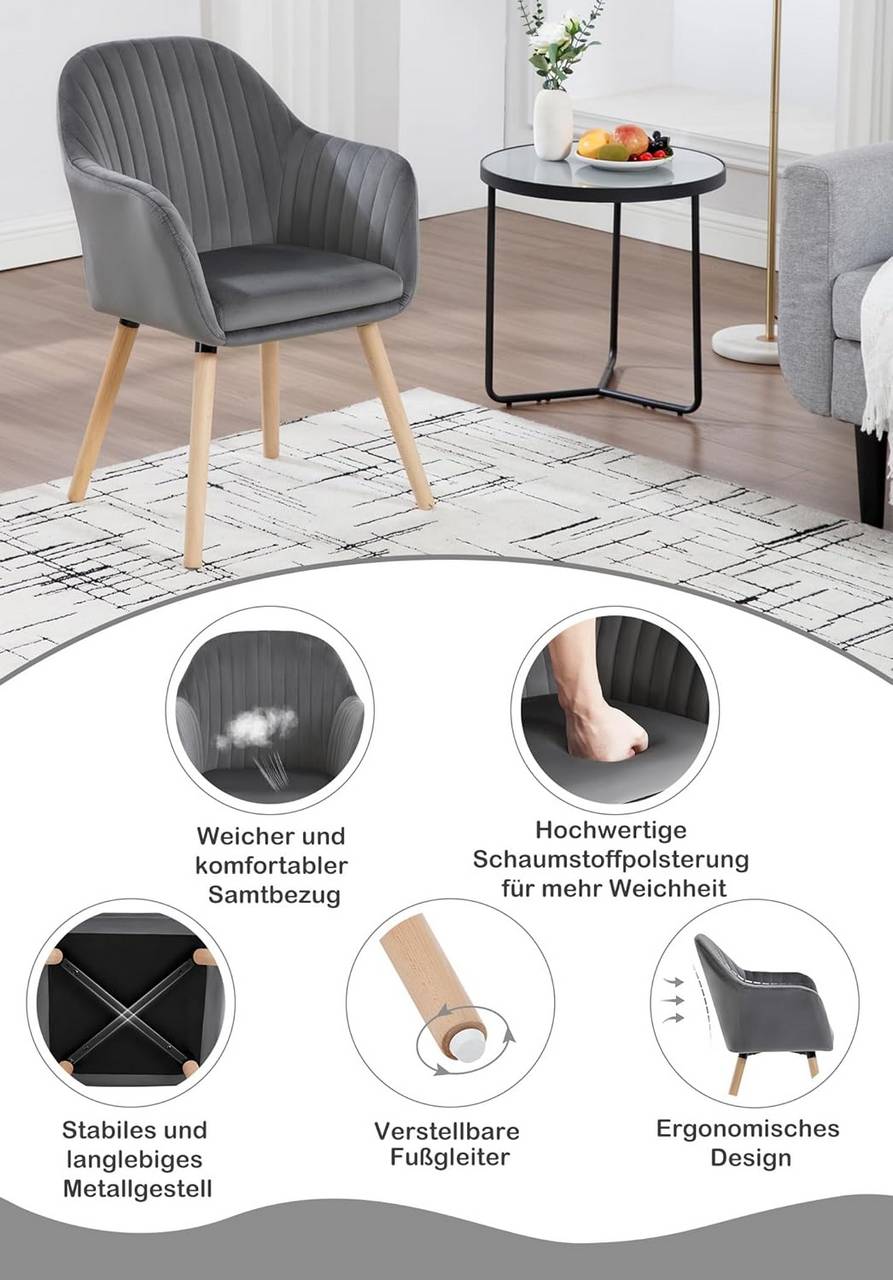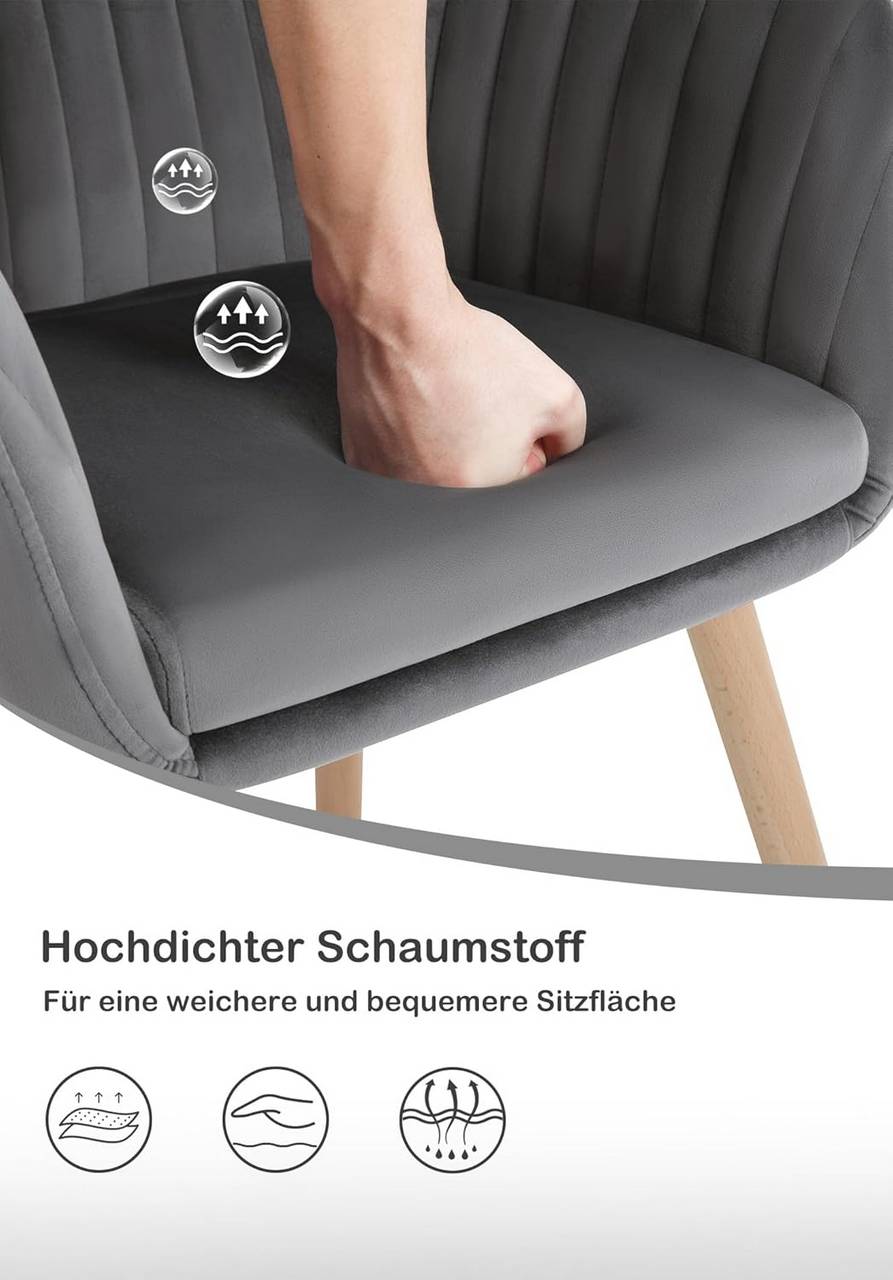 Tvirta ir ilgaamžė: WOLTU tamsiai pilka kėdė aptraukta atspariu aksomu, užpildyta aukštos kokybės putomis ir turi tvirtą kryžminę metalinę konstrukciją su medinėmis kojomis. Maksimali apkrova – iki 120 kg.