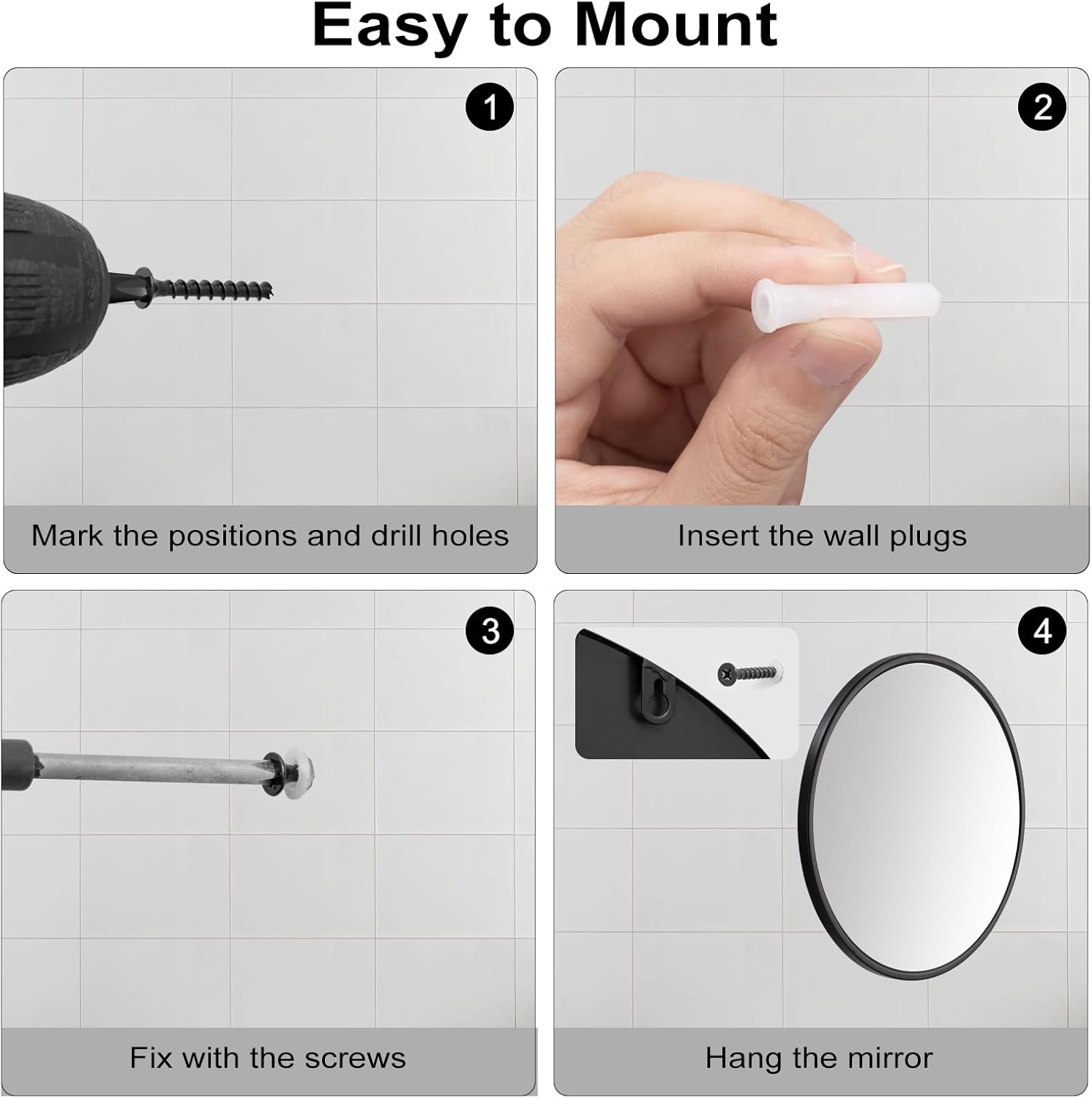 Greitas montavimas: veidrodis turi iš anksto išgręžtas tvirtinimo vietas, komplekte yra visi reikalingi tvirtinimo elementai ir aiški instrukcija, todėl jį galima lengvai pritvirtinti prie sienos net vienam. Tinka plytoms ir betoninėms sienoms (netinka gipso kartono sienoms).