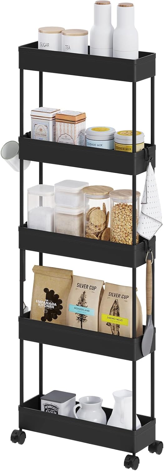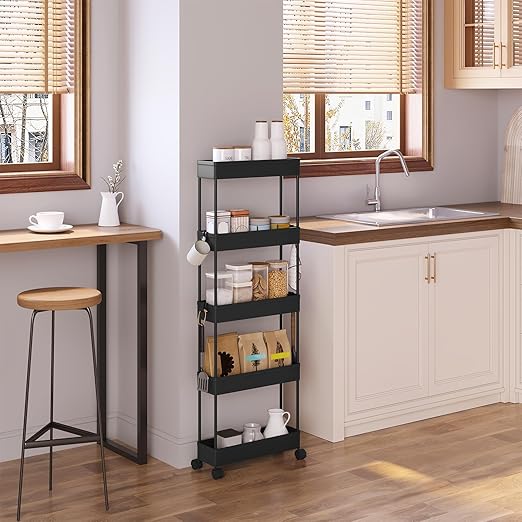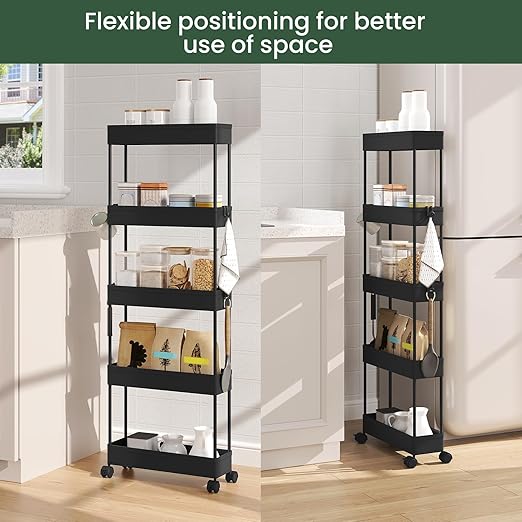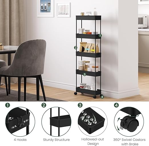 Daug vietos daiktams: turi 5 lentynas ir 4 kabliukus, todėl suteikia pakankamai vietos įvairiems daiktams laikyti. Siaura konstrukcija leidžia patogiai pastatyti net ankštose vietose.