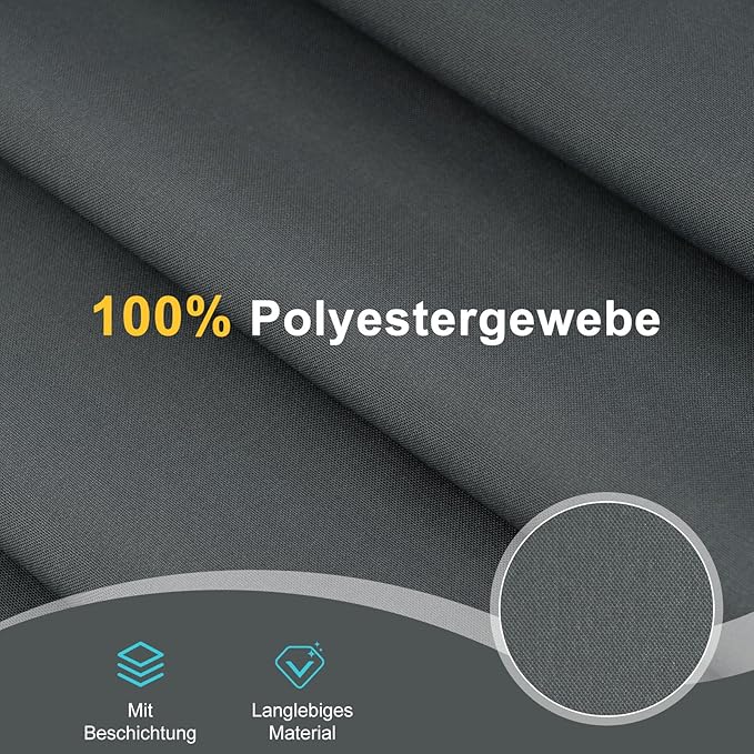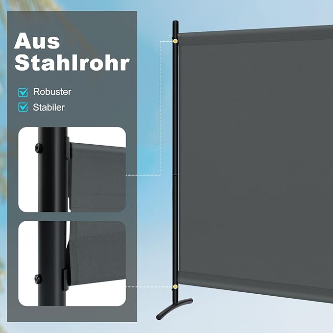 Stabilus ir ilgaamžis: WOLTU kambario pertvara pagaminta iš 160 g/m² poliesterio audinio su PA danga, todėl yra atspari vandeniui, laidžiai orui, patvari ir atspari plyšimui. Plieninių vamzdelių rėmas ir lenktas pagrindas suteikia pertvarai gerą stabilumą.