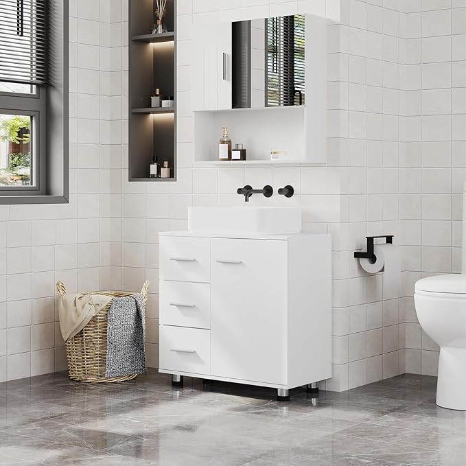 Daug vietos daiktams: balta vonios spintelė turi 3 stalčius ir dviejų lygių spintelę, kurioje galima laikyti įvairius vonios reikmenis. Už durelių galima paslėpti privačius daiktus, kad išlaikytumėte tvarką ir apsaugotumėte privatumą.