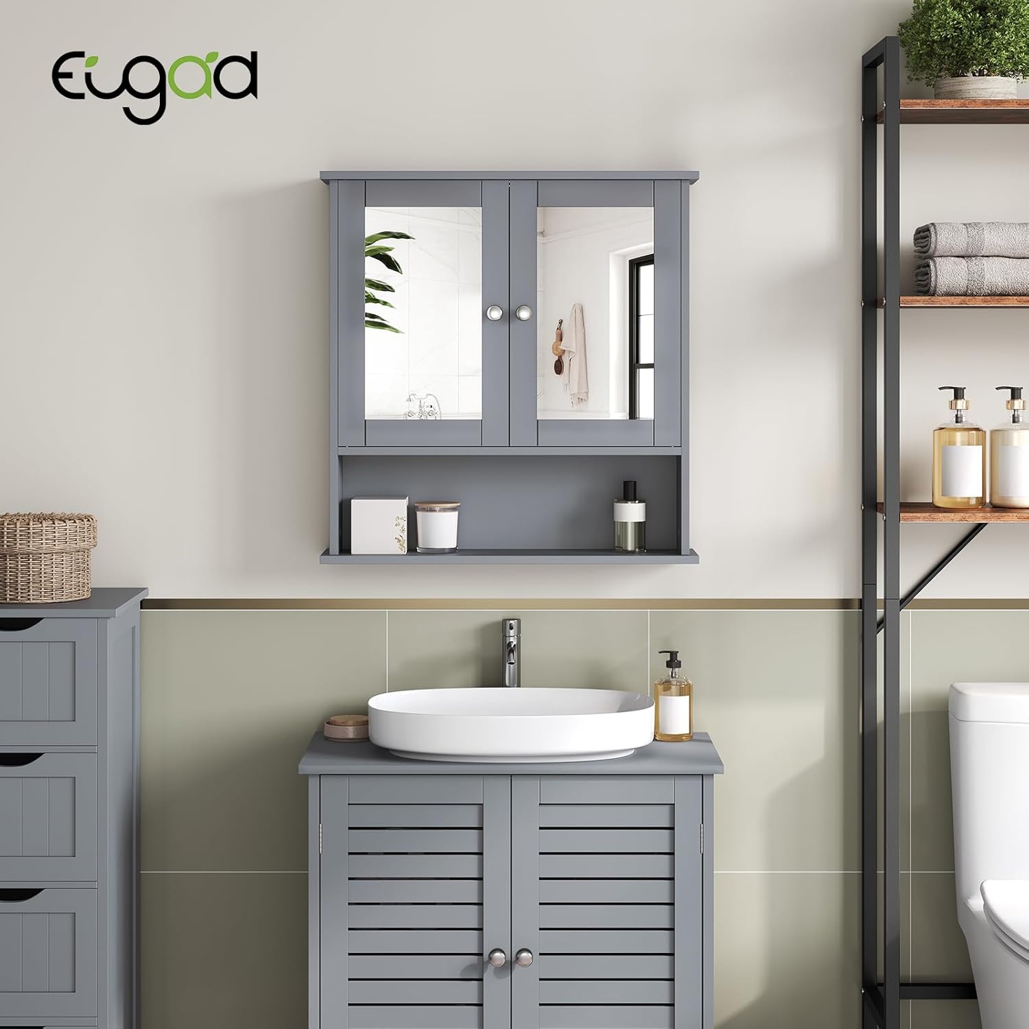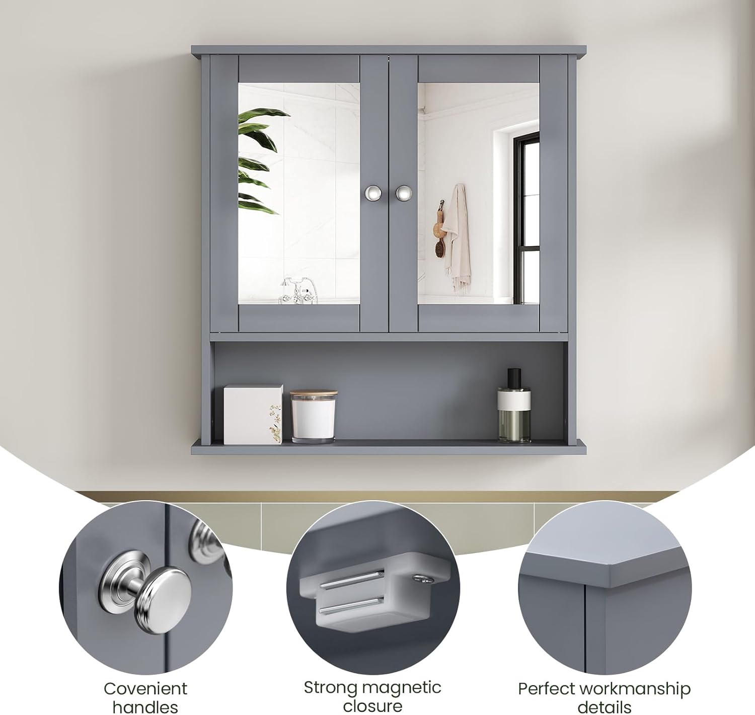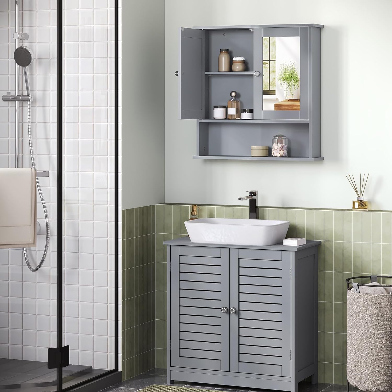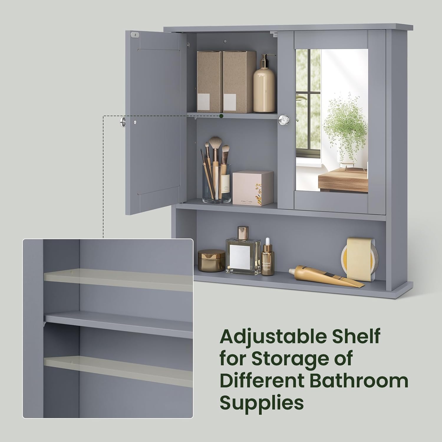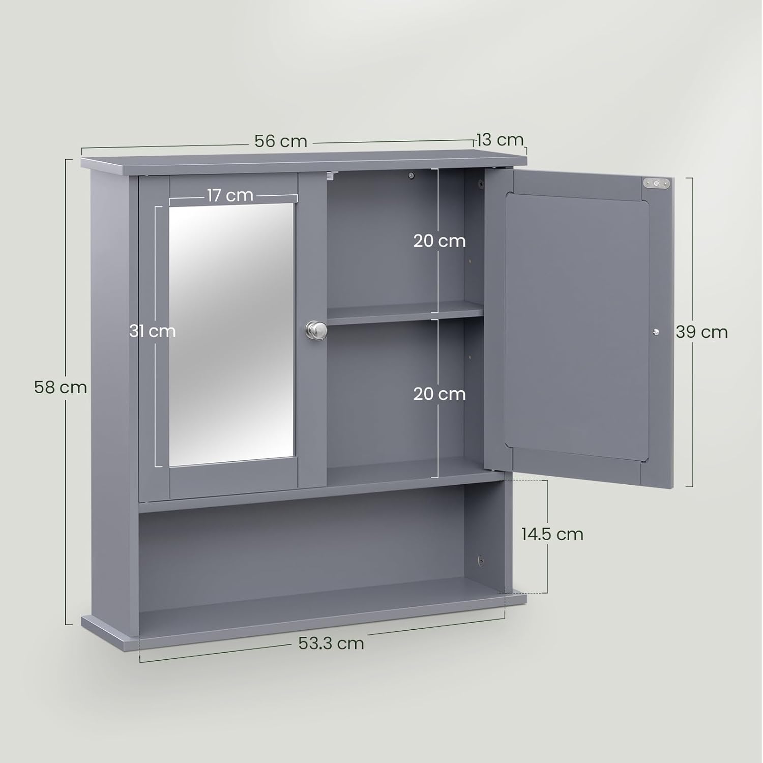 Skyrių dizainas: vidinė laikymo erdvė padalinta į dvi dalis su reguliuojama lentyna, todėl daiktus galėsite suskirstyti pagal dydį. Čia patogiai tilps šampūnas, dušo želė, kosmetika, tualetinis popierius ir kiti reikmenys. Spintelės matmenys: apie 56 x 13 x 58,5 cm. Su šia veidrodine spintele jūsų vonioje vyraus tvarka.