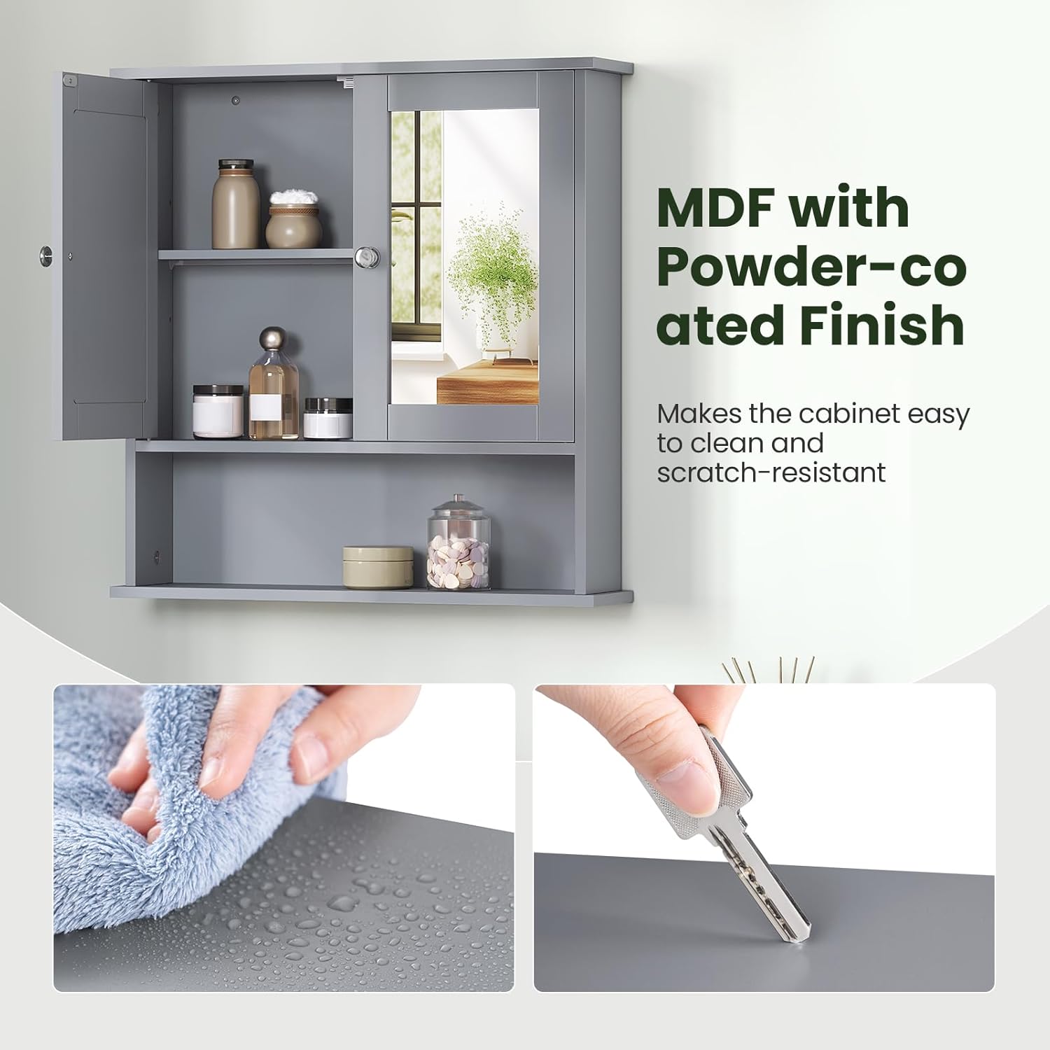 Patvari ir atspari drėgmei: vonios spintelė pagaminta iš MDF plokštės, kuri yra tvirta ir ekologiška. Paviršius atsparus drėgmei ir vandeniui. Nerūdijančio plieno vyriai užtikrina sklandų ir lengvą durelių atidarymą bei uždarymą.